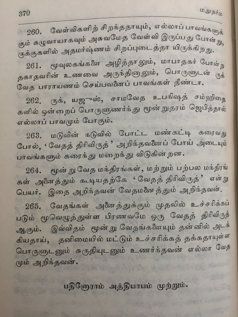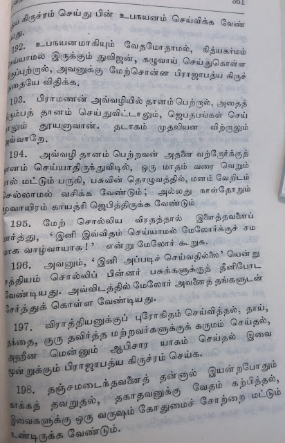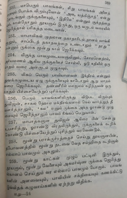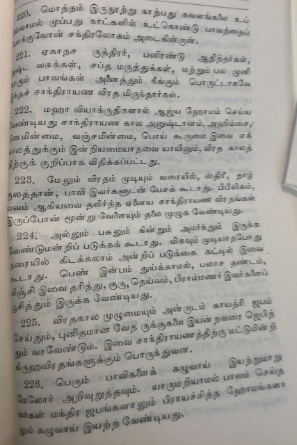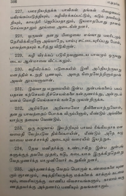 - 2.காயத்ரி மூலமும் (11-195, 11-226) , ரிக்வேத மந்திரங்கள் மூலமும் (11-250 to 11-260) பிராயச்சித்தம் செய்வது. இதற்கான நீண்ட மந்திர பட்டியல் உள்ளது. கீழே ஆங்கிலத்தில் கொடுத்துள்ளேன் . பிராணாயாமம் (மூச்சுப் பயிற்சி) , ஓம் உச்சரித்தல், ஹோமங்கள் ஆகியனவும் சடங்குகளில் அடக்கம் — இது தவிர வேறு சில சடங்குகளையும் கொடுத்துள்ளார். அவை இப்போது பின்பற்றப்படுவதில்லை . பல பிராமணர்களுக்கு உரைகாரர்கள் எழுதியதை படித்தல்தான் அவை என்ன என்பதே தெரியும்; புரியும்