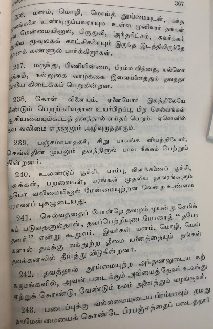 - பிராணிகளும் தவம் செய்து (11-241) அல்லது நியம நிஷ்டைகளைக் கடைபிடித்து சொர்க்கத்துக்குப் போகின்றன என்ற செய்தியை மநு இங்கே தெரிவிக்கிறார். இந்தியாவில், அதிலும் குறிப்பாகத் தமிழ் நாட்டில், பல கோவில்கள் பறவைகள், மிருகங்களுடன் தொடர்புடையவை. அங்கே அவற்றுக்கான சிலைகளும் வாகனங்களும் உள்ளன.