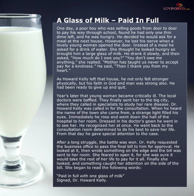 மெதுவாக அதைக் குடித்த அந்தச் சிறுவன், “நான் இந்தப் பாலுக்காக எவ்வளவு கொடுக்க வேண்டும்?” என்று அந்தப் பெண்ணிடம் கேட்டான்.