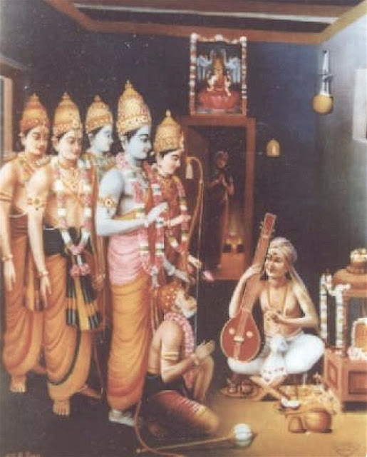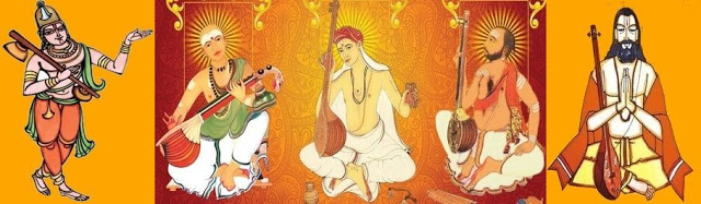 We can now see clearly where Sri Tyagaraja belongs! And what would have been the atmosphere like in Tanjore area where he too was born . He was born in Tiruvarur on 4 May 1767 ( very easy to remember: 4-5-67). By that time Bhakti movement had taken root. The songs of Purandaradasa and the story of Bhadrachala Ramadas were already well known in orthodox circles. Tyagaraja combined with it the ideals of Narada and the elements of Vedanta. His own experience of worship of Ishtadevata through mantra japa, puja and Kirtana provided an excellent model. Singing with the mouth and thinking in the mind, we can burn away all sins, declared Andal in 9th century:”:vaayinal paadi manadinaal sindikka poya pizhaiyum pukutaruvan ninranavum teeyinil toosakum”. [“வாயினால் பாடி மனதினால் சிந்திக்க, போய பிழையும் புகுதருவான் நின்றனவும் தீயில் தூசாகும்“]