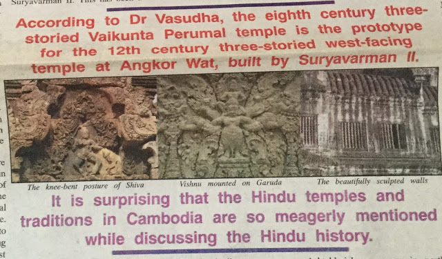 அமெரிக்காவில் ப்ளோரிடா பல்கலைக் கழகத்தில் சமயத் துறையில் பேராசிரியராகப் பணியாற்றும் டாக்டர் வசுதா நாராயணன் (Dr Vasudha Narayanan) காஞ்சீபுரம் கோவில்களையும் கம்போடியா கோவில்களையும் ஒப்பிட்டு எழுதிய நூலின் மதிப்புரை போனறது அக்கட்டுரை.