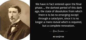 Rene Guenon was one of the earliest Western thinkers to point out the problems of the modern world. His book “The Crisis of the Modern World” was first published in French in 1927 and was translated by Arthur Osborne into English in 1942. The quotation in this piece is taken from this book.