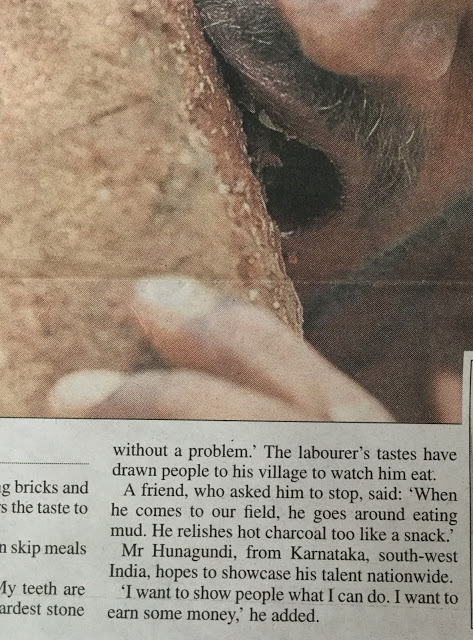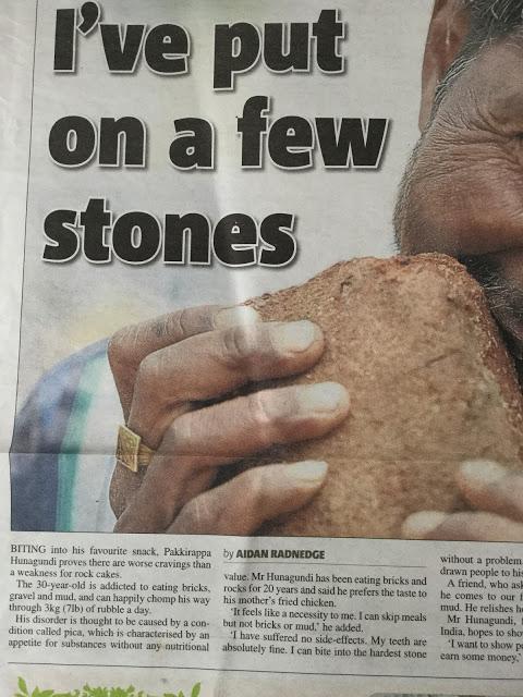 மண்ணுண்ட கண்ண பிரானை நாம் அறிவோம். செங்கல் உண்ணும் பக்கிரப்பா செய்வதைக் கேட்டால் நமக்கு பகீர் என்ற உணர்ச்சி ஏற்படும். ஒரு நாளைக்கு மூன்று கிலோ செங்கல் சாப்பிடுகிறார். அதுவும் 20 வயது முதல். இப்போது வயது 30 என்று 2014ல் வெளியான லண்டன் மெட்ரோ நியூஸ் பேப்பர் எழுதுகிறது . ஆக 2020ல் அவருக்கு 36 வயது என்று சொல்லலாம். இந்த ‘பகீர்’ அப்பா கர்நாடகத்தில் வசிக்கிறார். முழுப் பெயர் ‘பக்கிரப்பா ஹுனகண்டி’ (Pakkirappa hunagundi) .
