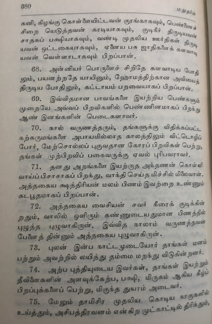 மானவ தர்ம சாஸ்திரம் என்றும், மனு ஸ்மிருதி என்றும் அழைக்கப்படும் மநு நீதி நூலின் கடைசி அத்தியாயத்தில் 12 ஆவது அத்தியாயத்தில் – 73 ஸ்லோகங்களை மே 9 ம் தேதி பதிவிட்டேன். மொத்தமுள்ள 2685 ஸ்லோகங்களில் மீதி உள்ள 73 ஸ்லோகங்களை இன்று காண்போம். கடைசி இரண்டு மூன்று அத்தியாயங்கள் பிரமாணர்களுக்கானது. ஆயினும் சில விஷயங்கள் பொதுவானவை.