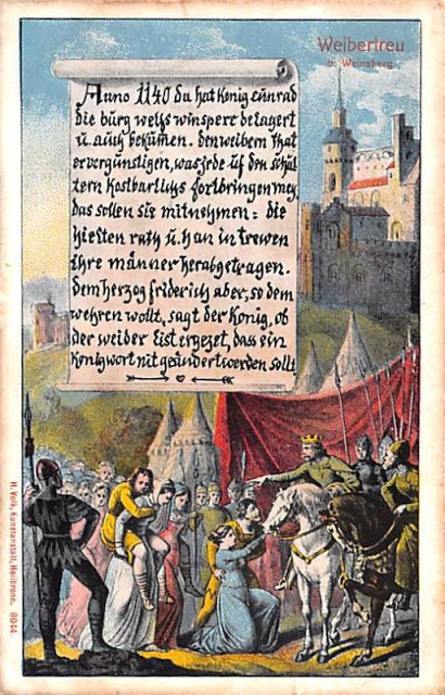 Together the women left their possessions, and lifting their husbands onto their shoulders, headed out of town. When the king, or emperor, saw what was happening he laughed and accepted the women’s clever trick, saying that a king should always stand by his word.[8] This story became known as the “Loyal Wives of Weinsberg” (Treue Weiber von Weinsberg). The castle ruins are today known as Weibertreu (“wifely loyalty”) in commemoration of the event.