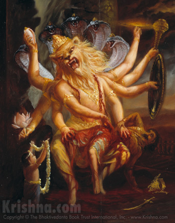 There Narada reveals that Prahlada was born with ‘divine sampath’ as we learn in the Gita, though in this case he is the son of an asura!Please see Bhagavatam,7.7.) But the point is: the Lord appears before him and asks him to seek boons Bhagavan says: