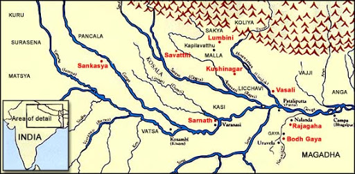 - ஸ்ராவஸ்தி : இரு அற்புதங்கள் நிகழ்ந்த இடம். இங்கு தான் புத்தர் பல அற்புதங்களை நிகழ்த்திக் காட்டினார். இந்த நகரில் தான் பெரும்பாலும் புத்தர் வசித்து வந்தார்.