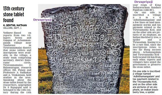 1.சடையவர்மன் சுந்தர பாண்டியனின் 13ஆவது ஆட்சியாண்டுக்  கல்வெட்டு வந்தவாசிக்கு அருகில் கண்டுபிடிக்கப்பட்டது,   இது கி.பி.1266ம் ஆண்டுக்கு கல்வெட்டு . இது வரி விலக்கு முதலிய செய்திகளைத் தந்தபோதும் , சுவையான விஷயம் என்ன வென்றால் இது குறிப்பிடும், திருவானைக்காவும் ஆதித்த மங்கலமும் சுமார் 250 கிலோ மீட்டர் தொலைவிலுள்ள ஊர்களாகும்.