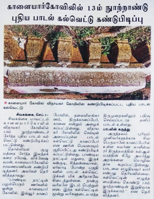 2. இரண்டாவது கல்வெட்டு பாடல் பெற்ற தலமான காளையார் கோவிலில் கிடைத்த பாடல் கல்வெட்டு ஆகும். கல்வெட்டுச் செய்தி தமிழில் இருப்பதால் வாசகர்களே படித்து அறிய முடியும்