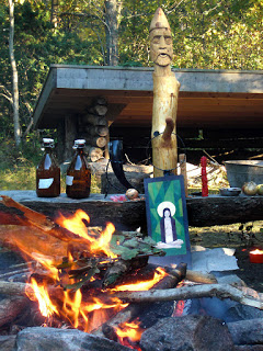 A Pagan or Heathen altar and ceremony in Sweden, 2009 in honour of their gods. In fact, several gods are represented on the altar. The central pole represents their god Frey. This is a pre-Christian practice.