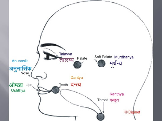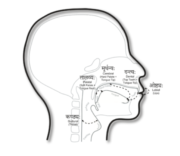 The individual Atman – soul- wishing to express something, sends orders through buddhi/intellect to the manas/mind. The mind then strikes at kayagni/the fire of the body and the latter urges the marital/ the vital wind, and the vital wind passing through Ursa/ the chest generates Svarajambu/sound vibration. The sound vibrations rise up to the top of the head from inside the murdhan, a cerebral point and strikes on various spots in the mouth, thereby creating varnam/letters which are divided into five categories.–Panini Shiksha 6-7-8