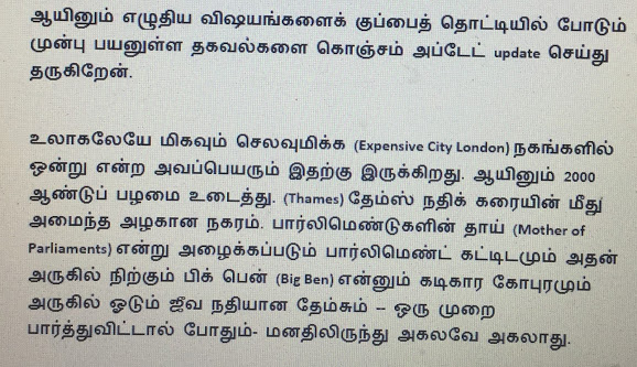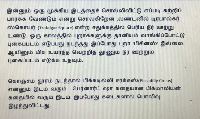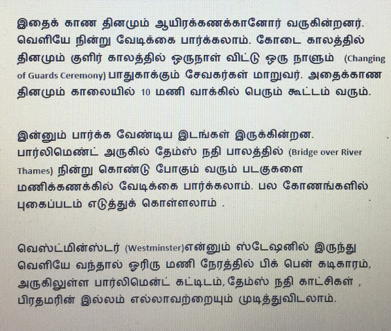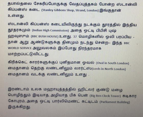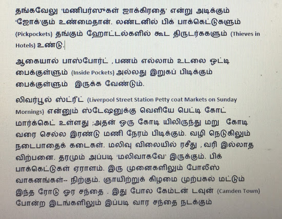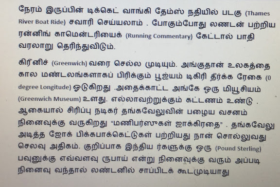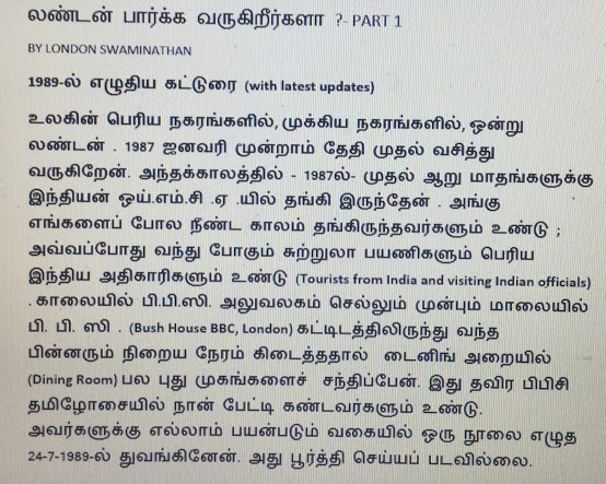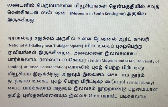 1989-ல் எழுதிய கட்டுரை (with latest updates)உலகின் பெரிய நகரங்களில், முக்கிய நகரங்களில், ஒன்று லண்டன் . 1987 ஜனவரி மூன்றாம் தேதி முதல் வசித்து வருகிறேன். அந்தக்காலத்தில் – 1987ல்- முதல் ஆறு மாதங்களுக்கு இந்தியன் ஒய்.எம்.சி .ஏ .யில் தங்கி இருந்தேன் . அங்கு எங்களைப் போல நீண்ட காலம் தங்கிருந்தவர்களும் உண்டு ; அவ்வப்போது வந்து போகும் சுற்றுலா பயணிகளும் பெரிய இந்திய அதிகாரிகளும் உண்டு (Tourists from India and visiting Indian officials) . காலையில் பி.பி.ஸி. அலுவலகம் செல்லும் முன்பும் மாலையில் பி. பி. ஸி . (Bush House BBC, London) கட்டிடத்திலிருந்து வந்த பின்னரும் நிறைய நேரம் கிடைத்ததால் டைனிங் அறையில் (Dining Room) பல புது முகங்களைச் சந்திப்பேன். இது தவிர பிபிசி தமிழோசையில் நான் பேட்டி கண்டவர்களும் உண்டு. அவர்களுக்கு எல்லாம் பயன்படும் வகையில் ஒரு நூலை எழுத