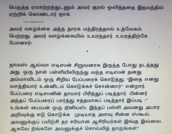 General Electric company உலகின் மிகப் பெரிய நிறுவனம் என்பதை அனைவரும் அறிவர். அதன் தலைமை நிர்வாகி CEO  ஜாக் வெல்ச் (Jack Welch), ஜாக் (Jack) என்று ஒரு புத்தகத்தை எழுதியுள்ளார். அதில் அவர் கூறும் சம்பவம் தான் இது.