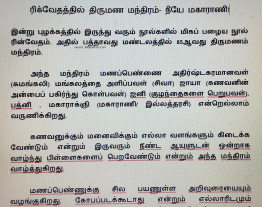 if u want the article in word format, please write to us.இன்று புழக்கத்தில் இருந்து வரும் நூல்களில் மிகப் பழைய நூல் ரின்வேதம். அதில் பத்தாவது மண்டலத்தில் 85ஆவது திருமணம்