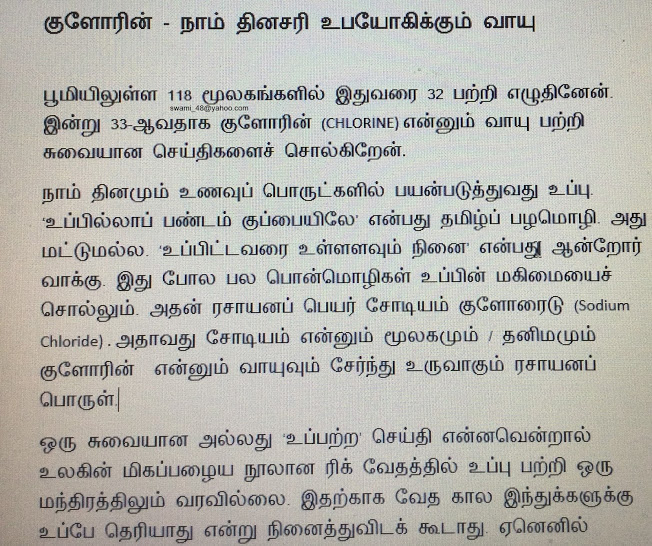 பூமியிலுள்ள 118 மூலகங்களில் இதுவரை 32 பற்றி எழுதினேன். இன்று 33-ஆவதாக குளோரின் (CHLORINE) என்னும் வாயு பற்றி சுவையான செய்திகளைச் சொல்கிறேன். நாம் தினமும் உணவுப் பொருட்களில் பயன்படுத்துவது உப்பு. ‘உப்பில்லாப் பண்டம் குப்பையிலே’ என்பது தமிழ்ப் பழமொழி. அது மட்டுமல்ல. ‘உப்பிட்டவரை உள்ளளவும் நினை’ என்பது ஆன்றோர்