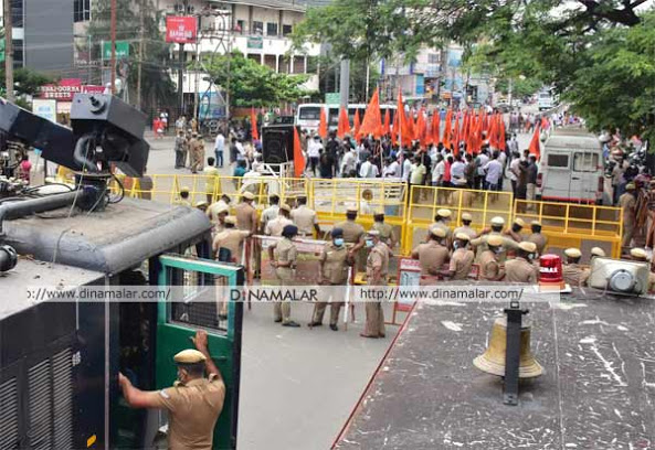 இந்து முன்னணியனரை எதிர்த்து, எஸ்.டி.பி.ஐ.,யினரும் திரண்டால் அப்பகுதியில் பதட்டமான சூழல் நிலவியது. கூட்டத்தினரை கட்டுப்படுத்த, போலீஸ் கமிஷனர், துணை கமிஷனர் தலைமையில் பலத்த போலீஸ் பாதுகாப்பு போடப்பட்டது. அனுமதியின்றி போராட்டம் நடத்த முயன்றதாக இந்து முன்னணியினரை போலீசார் கைது செய்தனர்.