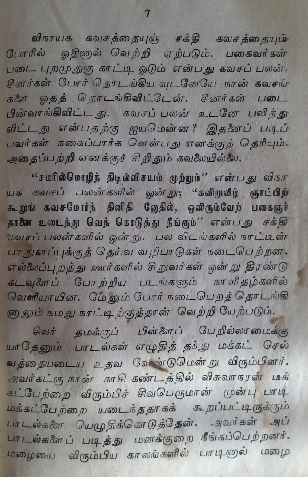 கவசங்களைப் பற்றி இதுவரை மூன்று கட்டுரைகளை எழுதினேன். இதற் கெல்லாம் மூல காரணமான புஸ்தகம் ராமசாமிப் புலவர் வெளியிட்ட பல கவசங்கள் அடங்கிய நூலாகும். இதற்குப் பின்னர் வந்த நூல்களில் பொழிப்புரை இல்லை, அர்த்தமும் இல்லை. ஆகையால் ராமசாமிப் புலவர் நூலை யாரேனும் முழுதுமாக வெளியிட வேண்டும். என்னிடமுள்ள நூல் தூள் தூளாகும் நிலையில் உள்ளது. காரணம் நாங்கள் எல்லோரும் ‘படித்துக்கிழித்தவர்கள்’ !!! அதாவது 1962 முதல் இந்த நூலை உபயோகித்து வருகிறோம்.