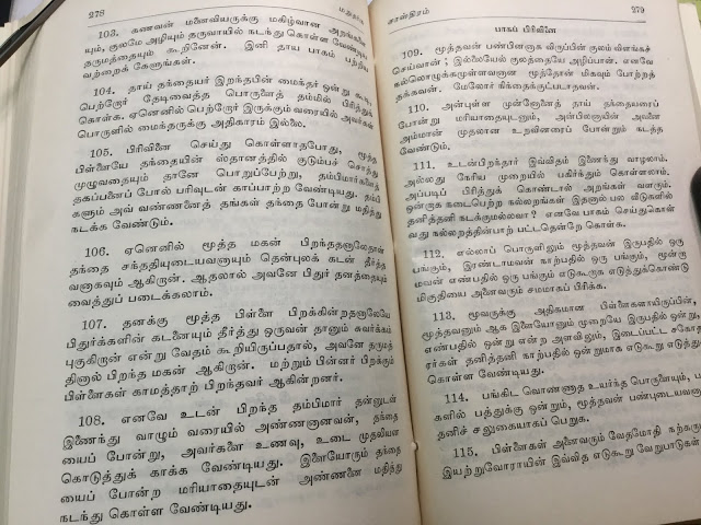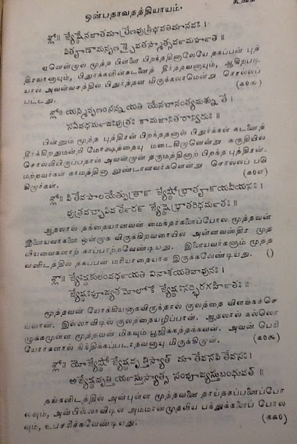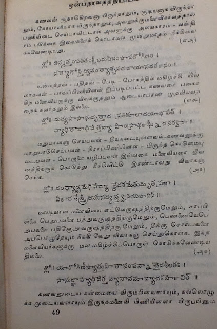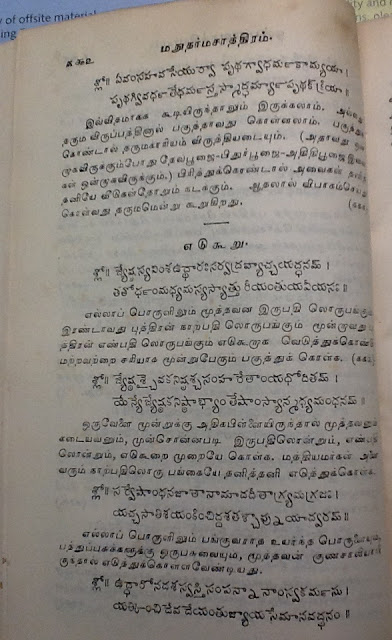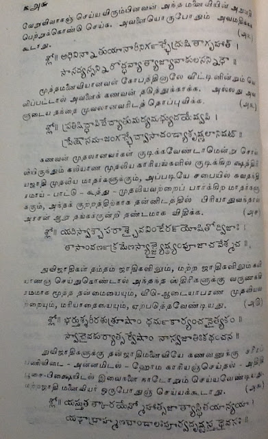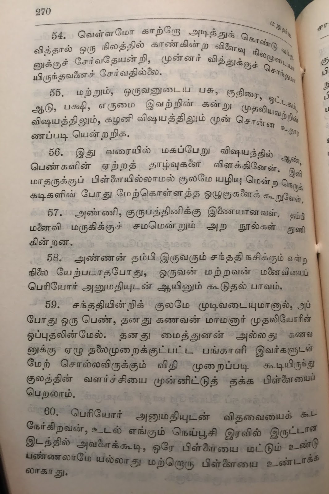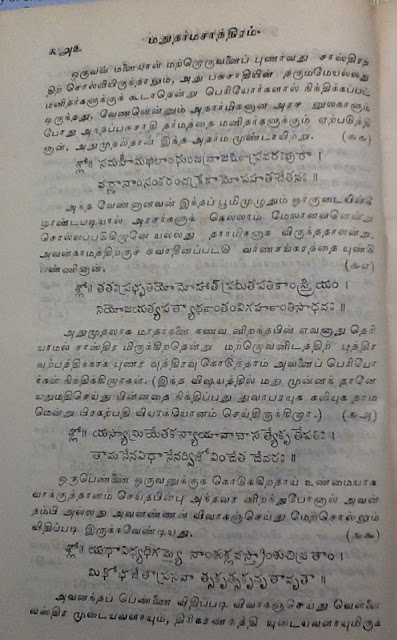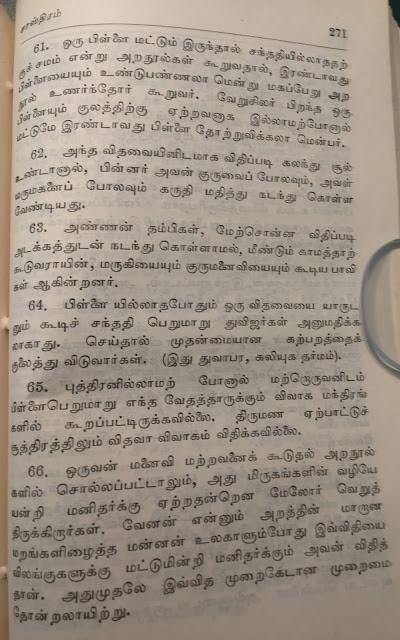 (இதுவரை எவ்வளவோ நூல்கள் படித்து விட்டேன். மநு போல பெண்களுக்கு ஆதரவாகக் கதைத்தவர் எவரும் இலர். பெண்கள் நோய்வாய்ப்பட்டிருந்தால், அவர்களுக்குக் குழந்தையே இல்லாவிடினும், அவர் அனுமதியின்றி வெளியேற முடியாது என்கிறார். பெண்களை அழவிட்டால், குடும்பம் வேறோடு சாய்ந்து அழியும் என்கிறார். சகோதரிகளுக்கு சகோதரர்கள் ஆடை ஆபரணங்களை அளித்து கமகிழ்ச்சிக் டலில் மிதக்க விட வேண்டும் என்கிறார்.