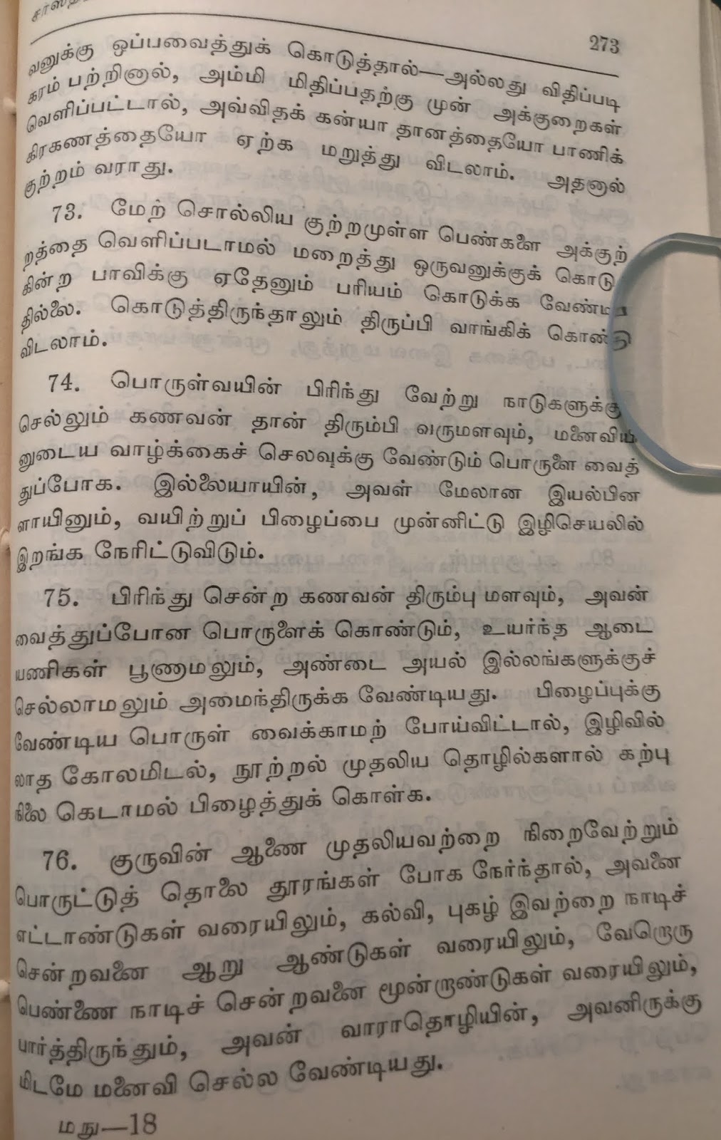 9-74 ல் மிக முக்கியமான உளவியல் விஷயத்தைச் செப்புகிறார். ஒருவன் திரைகடல் ஓடித் திரவியம் தேட நீண்ட காலம் மனைவியைப் பிரிந்து சென்றால் அவளது வாழ்க்கைக்கு வழி செய்துவிட்டுப் போக வேண்டும் அல்லது அவள் வேறு ஒருவனுடன் ஓடிப்போய் விடுவாள் என்கிறார்.