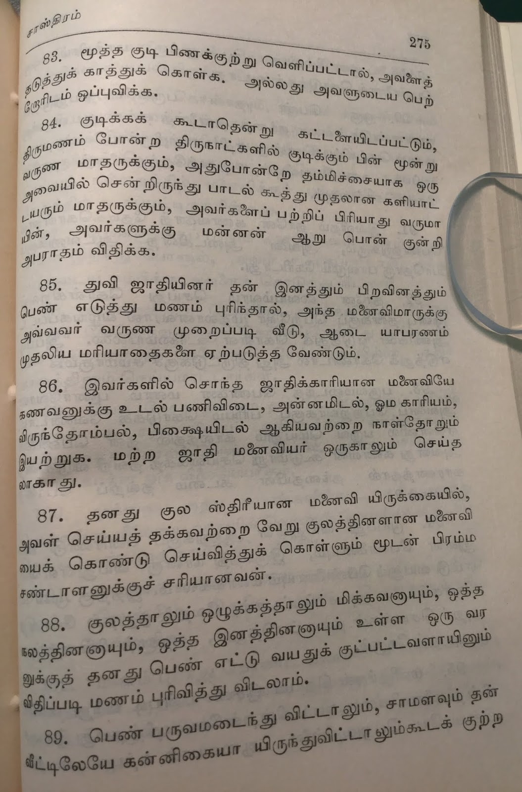 9-78 மனைவி குடிகாரியாகவோ, ஊதாரியாகவோ இருந்தால் நகைகளைப் பிடுங்கி 3 மாதம் தனியே வை என்கிறார். (ஆக அந்தக் காலத்திலும் வீட்டுக்குள் சூர்ப்பநகைகள், தாடகைகள் இருந்தனர் போலும்).