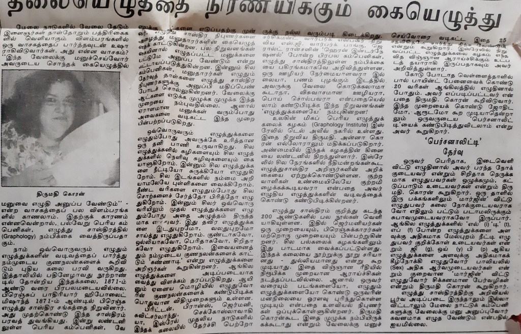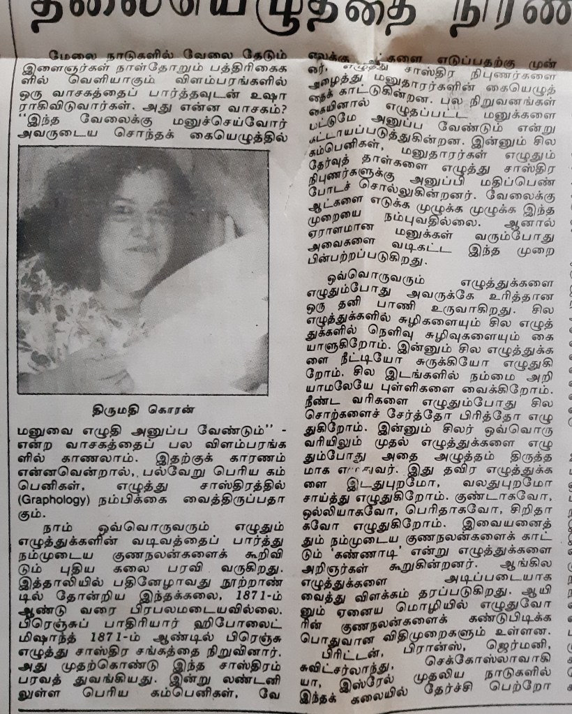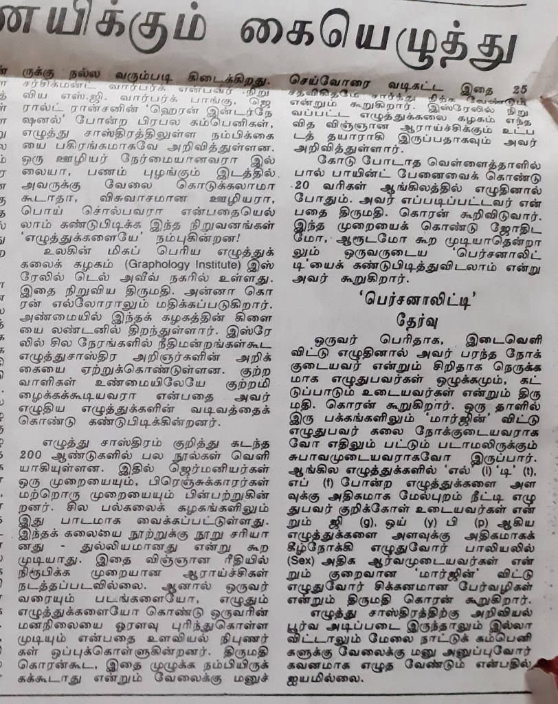 பதவி உயர்வு தருவது அல்லது தர மறுப்பது இவை எல்லாம் அறிவியல் ரீதியிலானது அல்ல என்று பல விஞ்ஞான சஞ்சிகைகள் எழுதியுள்ளன .ஆகையால் கையெழுத்து இயல் (Graphology) பற்றி உறுதியாக ஒன்றும் சொல்வதற்கில்லை. இத்துடன் 1992ல் நான் தினமணியில் எழுதிய கட்டுரையை இணைத்துள்ளேன் .