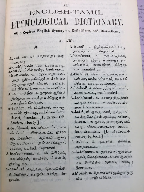 Prof P Sankara Narayana had done a marvellous job 100 years ago by bringing out an English – Tamil Etymological dictionary. He had already brought out English -Telugu dictionary as well. Probably he is the only one who had done two huge dictionaries in two languages.