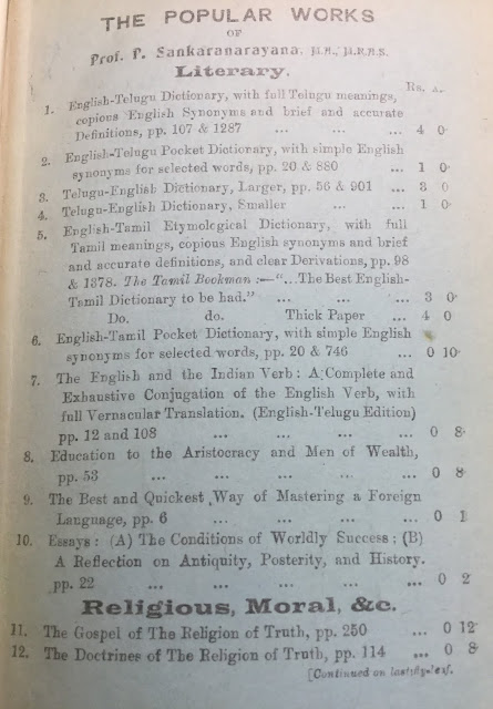 But P Sankaranarayana’s work is huge with over 1300 pages priced only three rupees in 1911. That was the enlarged second edition. From his titles we know that he worked for the Presidency College in Madras. Like Mughal Emperor Akbar’s Din- Ilahi , P Sankaranaraya had his own religion called ‘Religion of Truth’. His book list includes his pet theme Religion of Truth. I could not find his profile in any website. Gregory James in his History of Dictionaries mentioned one P.Sankaranarayana Chettiar.