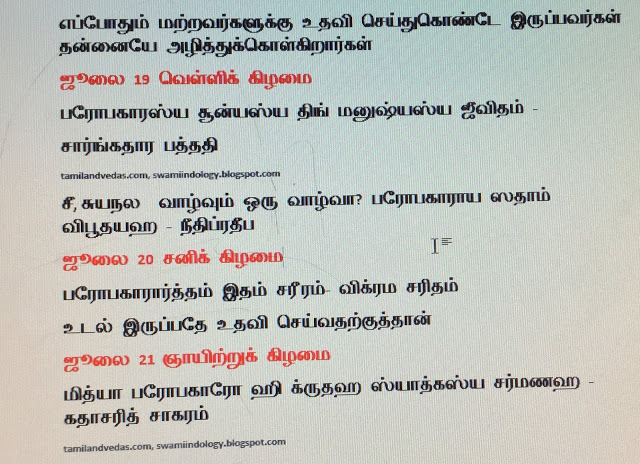 சுவாமி விவேகநந்தர் நினைவு தினம்; 8- ஆனித் திருமஞ்சனம்; 13- சாதுர்மாஸ்ய விரத ஆரம்பம்; 14- விம்பிள்டன் பைனல், உலக கோப்பை கிரிக்கெட் பைனல்,16- குரு பூர்ணிமா;17 ஆடிப்பண்டிகை 27- ஆடிக்கிருத்திகை; 31- ஆடி அமாவாசை.