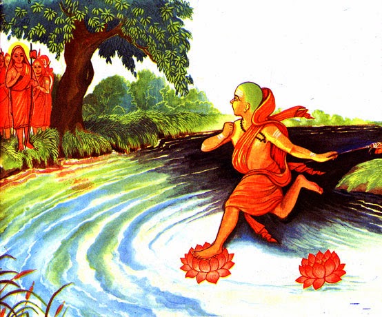 ஆதி சங்கரரின் சீடரான பத்மபாதரை எதிர்க்கரையில் இருந்த சங்கரர் அழைத்தார். உடனே அவர் நீர் என்றும் பாராது விரைந்து செல்ல அவர் நீர் மீது கால் வைத்த இடம் எல்லாம் தாமரை மலர் தோன்றி அவரைத் தாங்கிச் சென்றது. இதனால் அந்த சிஷ்யருக்கு பழைய பெயர் மறைந்து போய் தாமரைக் காலன் (பத்மபாதர்) என்ற புதுப்பெயர் தோன்றியது.