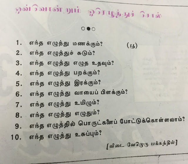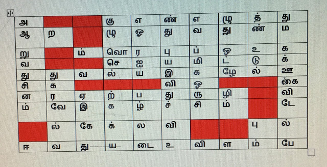 கூடியமட்டிலும் சொற்கள் பிரிக்கப்படவில்லை. மேலும் கீழுமாக, குறுக்கும் நெடுக்குமாகப் பாருங்கள்; சின்ன வயதில் பள்ளிக்கூடத்தில் கற்றது இவை.