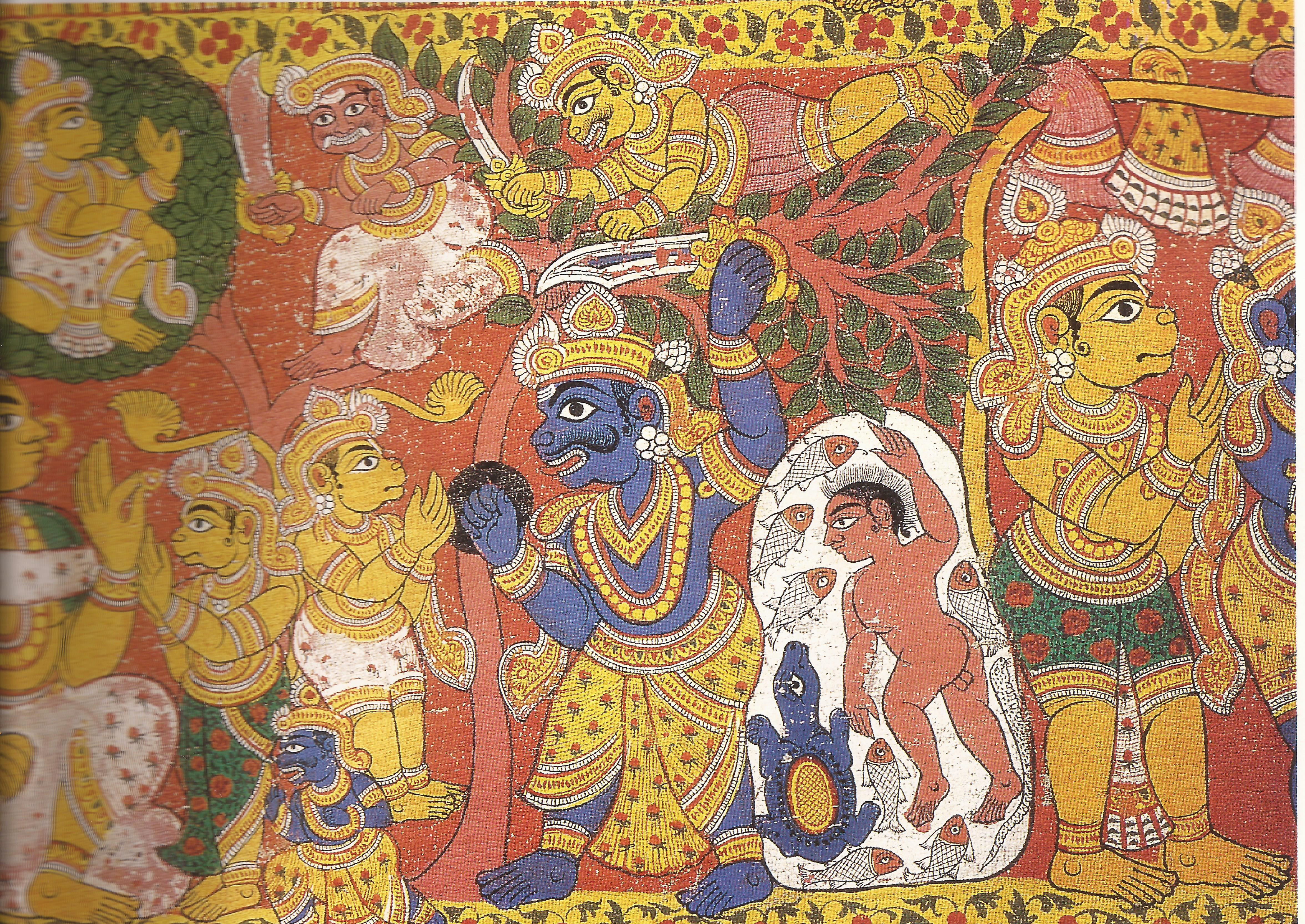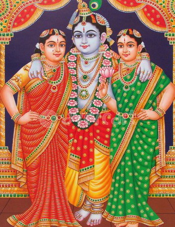 Lord Krishna with his wives Rukmini and Sthyabhama