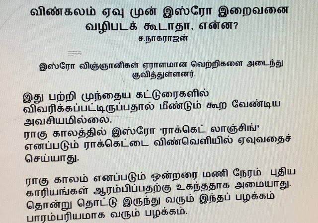 I. IANS reports from Chennai, Nov 7, 2013 as follows: The Indian Space Agency may be sending rockets and satellites to various planets but is also guided by their own superstitions and beliefs, said a retired official of the Indian Space Research Organisation (ISRO).