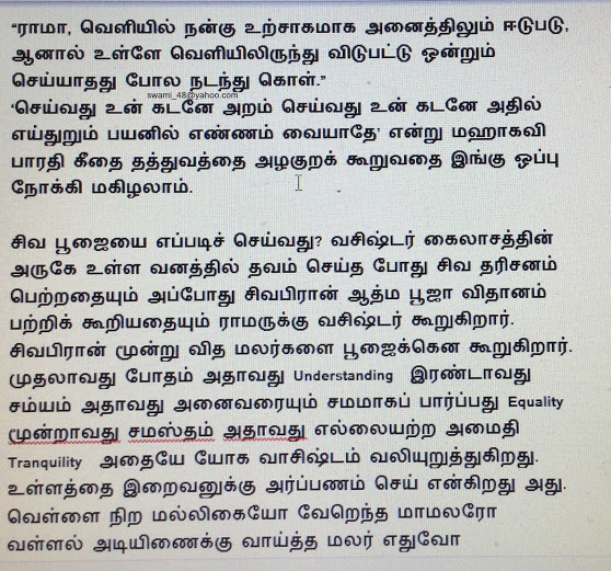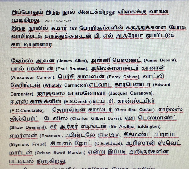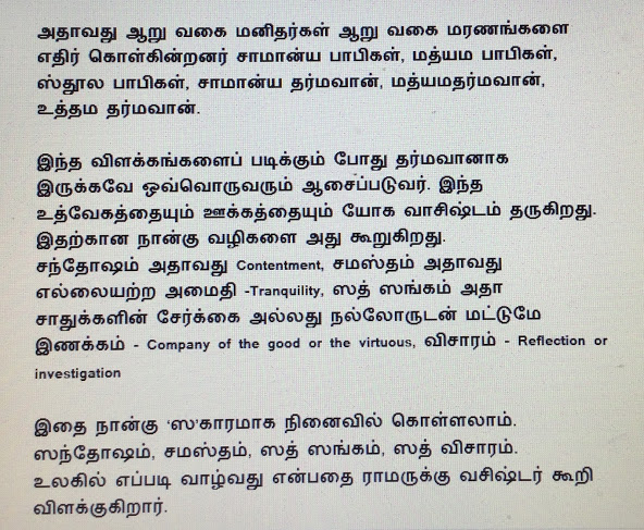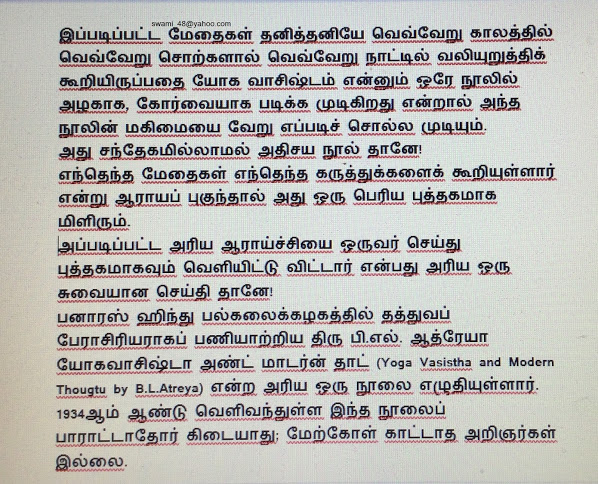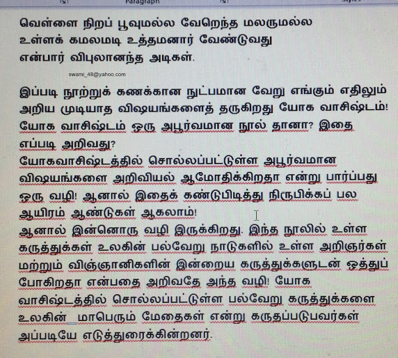 அன்பார்ந்த தமிழ் நெஞ்சங்களே சந்தானம் நாகராஜன் வணக்கம். யோக வாஷிடம் என்ற அரிய நூலின் பெருமைகளை ஒரு சிறிது பார்த்தோம். மேலும் தொடர்வோம்.