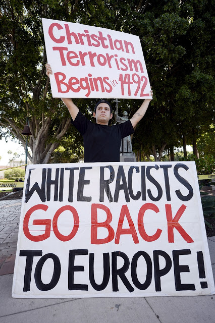 A statue in Providence, Rhode Island, was splashed from head to toe Monday with red paint, and a sign reading “Stop celebrating genocide” was leaned against the pedestal.