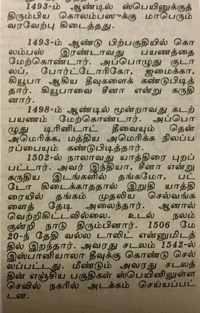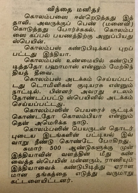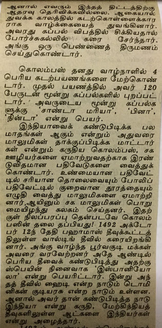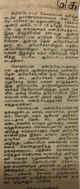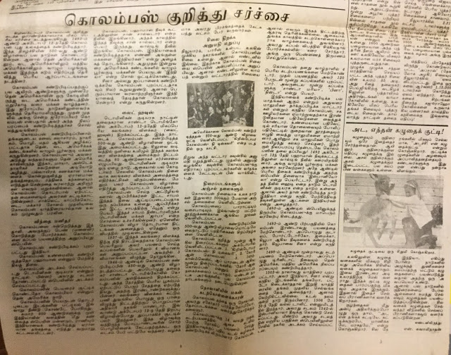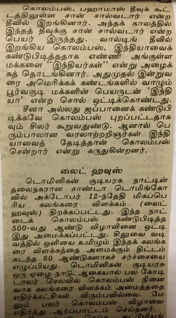 1992ம் ஆண்டு நவம்பர் 8-ல் தினமணிப் பத்திரிக்கையில் நான் கொலம்பஸின் புத்துலகக் கண்டுபிடிப்பின் 500ஆவது ஆண்டு விழாவை ஒட்டி ஒரு கட்டுரை எழுதினேன். அப்பொழுதே அவரது விழாவுக்கு எதிர்ப்பு அலைகள் கிளம்பின. சென்ற மாதமும் இதே போல ஒரு விழாவுக்கு எதிர்ப்பு அலைகளும் ஆதரவு அலைகளும் கிளம்பி கொலம்பஸ் சிலைக்கு கரி பூசும் அளவுக்கு அது போய்விட்டது. கொலம்பஸ் செய்த அக்கிரமங்கள், அதிசயங்கள் பற்றிய கட்டுரை – “கொலம்பஸ் குறித்து சர்ச்சை” — இதோ:–