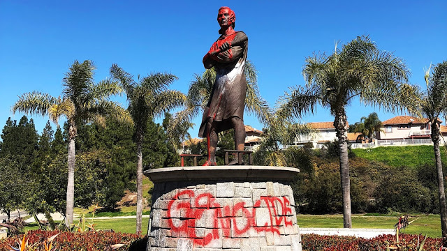 The word “genocide” was written in orange paint on the rear of the pedestal.