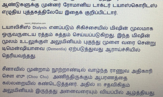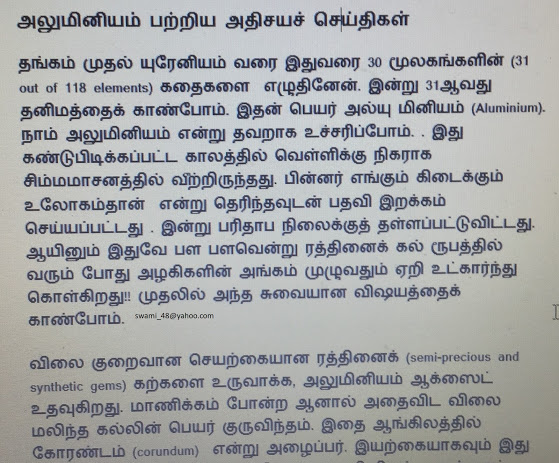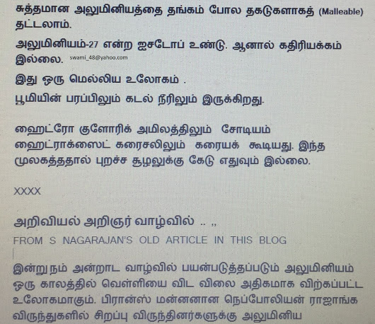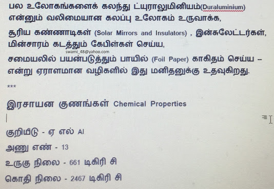அலுமினியம் பற்றிய அதிசயச் செய்திகள்தங்கம் முதல் யுரேனியம் வரை இதுவரை 30 மூலகங்களின் (31 out of 118 elements) கதைகளை  எழுதினேன். இன்று 31ஆவது தனிமத்தைக் காண்போம். இதன் பெயர் அல்யு மினியம் (Aluminium). நாம் அலுமினியம் என்று தவறாக உச்சரிப்போம். . இது கண்டுபிடிக்கப்பட்ட காலத்தில் வெள்ளிக்கு நிகராக சிம்மமாசனத்தில் வீற்றிருந்தது. பின்னர் எங்கும் கிடைக்கும்……………………….