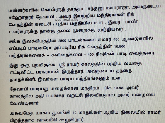 ரிக் வேதத்தில் உள்ள மஹாபாரத, ராமாயண மன்னர்களின் பெயர்கள் அதன் காலத்தைக் கணக்கிட உதவி புரிகின்றன. ராமன், ப ரசுராமன் , ஜமதக்கினி, தேவாபி ஆகிய பெயர்கள் ரிக் வேதத்தின் புதிய பகுதிகளில் காணக் கிடைக்கின்றன . இதைப் பலரும் கவனிக்க தவறி விட்டனர். இதோ சில சுவையான தகவல்களும் அதன் அடிப்படையிலான காலக் கணக்கீடும் :–உலகிலேயே மிகப் பழைய சமய நூல் ரிக் வேதம். இதை ஹெர்மன் ஜாகோபி மற்றும் சுதந்திரப் போராட்ட வீரர்