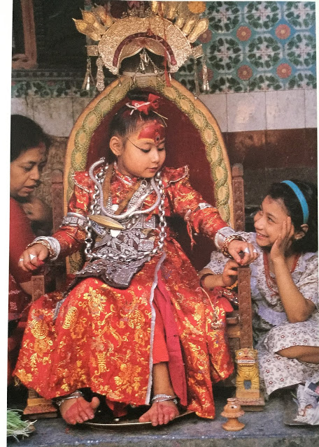 நேபாள நாட்டில் குமாரி என்னும் ஒரு இளம் பெண், கடவுளின் அம்சம் உள்ளவராகத் தேர்ந்தெடுக்கப்பட் டு வழிபடப்படுகிறார். 32 சாமுத்ரிகா லக்ஷணங்கள் உடைய ஒரு சிறுமி இப்படிக் குமாரியாகத் தேர்ந்தெடுக்கப்படுவார். அவர் பருவம் எய்திவிட்டால் அவர் மீதுள்ள தெய்வாம்சம் போய்விட்டது எனப் பொருள்; வேறு ஒரு பெண் தேர்ந்தெடுக்கப்படுவாள். முன்னொரு காலத்தில் திரைக்குப் பின்னால் கடவுள் இருப்பதாக எண்ணி நேபாள மன்னர்கள் ஆட்சி செய்தனர். ஒரு மன்னருக்கு ஆர்வம் தாங்கவில்லை. திரைக்குப் பின்னால் இருப்பது தேவியா இல்லையா என்ற புதிருக்கு விடை காண திரையைத் திறந்தார். பின்னால் இருந்த இறைவிக்குக் கோபம் வரவே என்மீது சந்தேகப் பட்டாயா? இனிமேல் நீயே ஒரு சிறுமியைத் தேர்ந்து எடுத்து அவளைக் கண்ணால் பார்த்துக்கொள். நான் அவள் மூலம் உனக்கு அருள் புரிவேன் என்று சொல்லிவிட்டுப் போய்விட்டாள்.