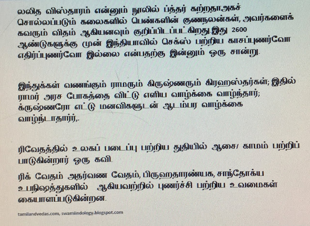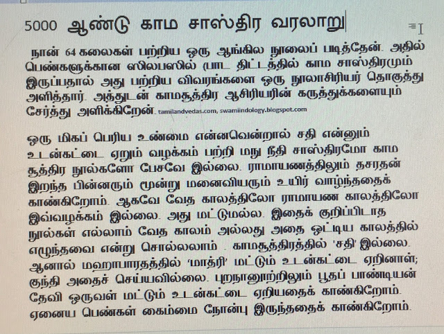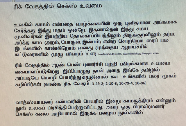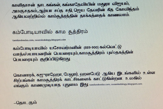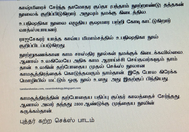 இது ஒரு புறம் இருக்க, உண்மையிலேயே வியத்தகு ஒரு உதாரணம் கிடைத்துள்ளது. கி.மு நாலாம் நூற்றாண்டில் தோன்றிய காம சூத்திரம் என்னும் பாலியல் நூலை வாத்ஸ்யாயனர் என்ற பிராமண அறிஞர் கி.பி. நாலாம் நூற்றாண்டில் எழுத்து வடிவில் கொடுத்தார். இதில் உள்ள ஒரு பகுதியை லண்டனில் இருக்கும் அறிஞர் சைமன்சிங் சங்கேத மொழி என்னும் புத்தகத்தில் கொடுத்திருக்கிறார். பெண்கள் கற்றுக் கொள்ளவேண்டிய ஆய கலைகள் 64ல் நாற்பத்தைந்தாவது கலை ரகசிய மொழியில் எழுதுவதாகும். காதல் விஷயங்களைப் பெண்கள் பகிரங்கமாக எழுத முடியாதே?