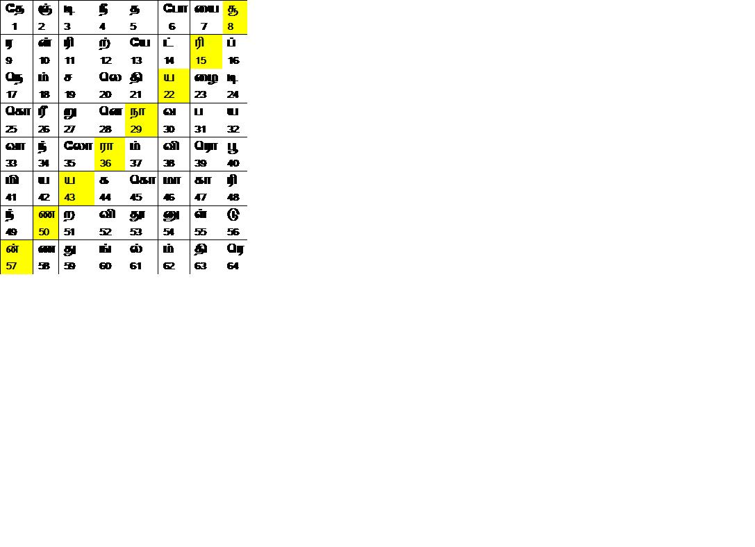இந்தப் பாடலில் உள்ள எழுத்துக்களைக் குதிரை பாயும் போக்கில் அமைக்க ஆரம்பித்தால் அது கீழ்க்கண்ட விதமாக சதுரங்கத்தின் 64 கட்டங்களில் அமையும்.