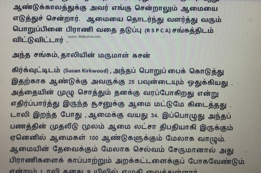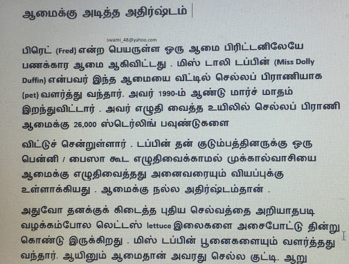 if u want the article in word format, please write to us.பிரெட் (Fred) என்ற பெயருள்ள ஒரு ஆமை பிரிட்டனிலேயே பணக்கார ஆமை ஆகிவிட்டது . மிஸ் டாலி டப்பின் (Miss Dolly Duffin) என்பவர் இந்த ஆமையை வீட்டில் செல்லப் பிராணியாக (pet) வளர்த்து வந்தார். அவர் 1990-ம் ஆண்டு மார்ச் மாதம்