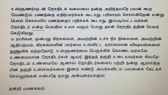 சோதிடம் உண்மையான ஒரு கலை. அதை அறிந்தோர் வெகு சிலரே! அறிந்ததாகச் சொல்லி காசு பறிப்போர் ஆயிரம் ஆயிரம்!!!