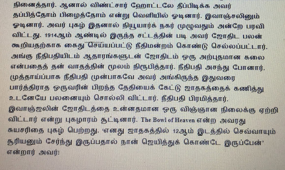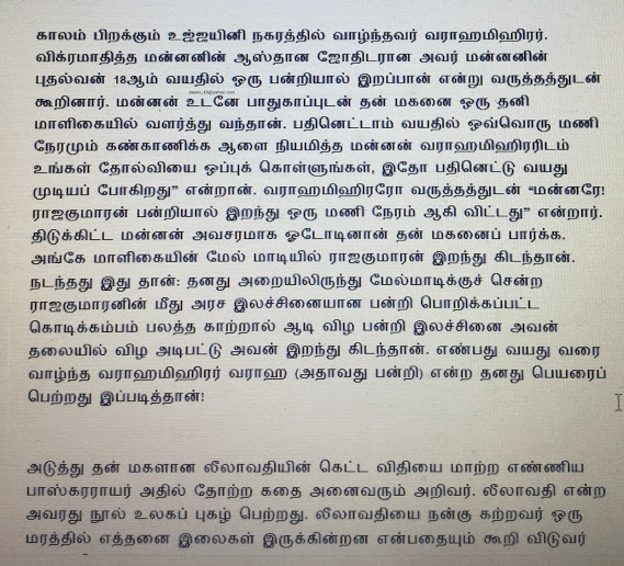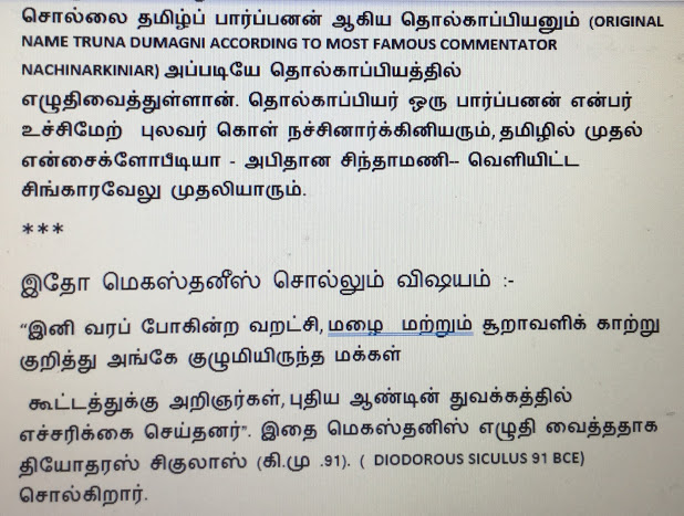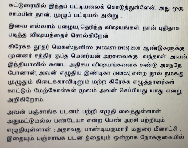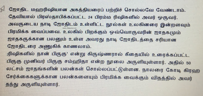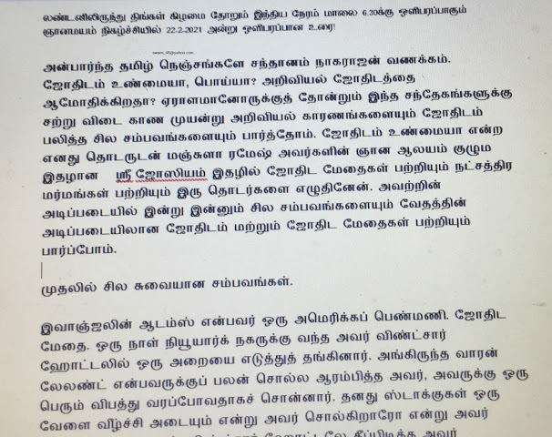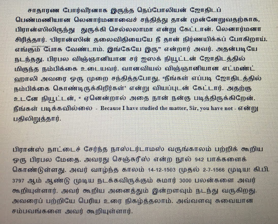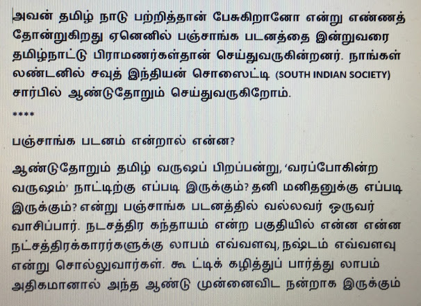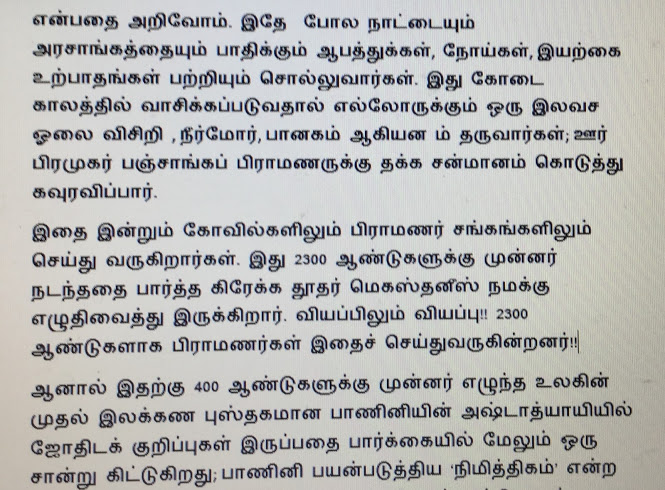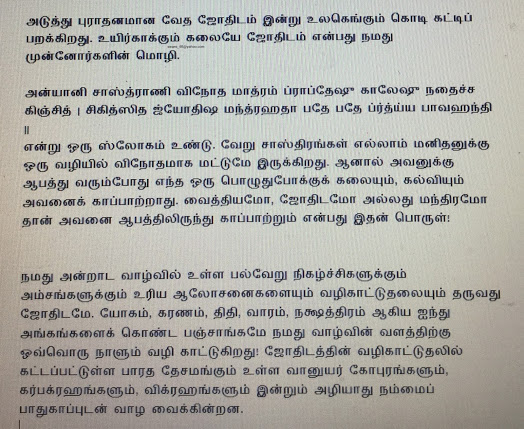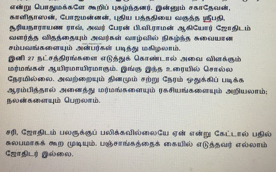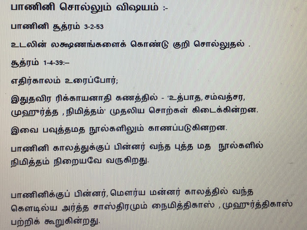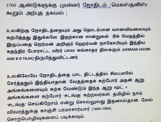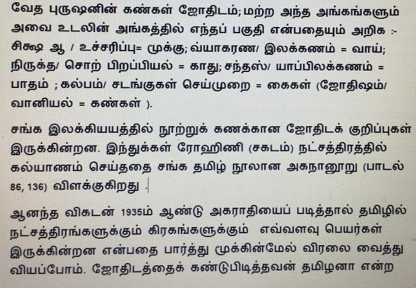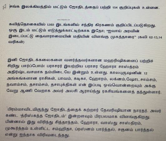 சங்கத் தமிழ் நூல்களில் ஜோதிடம் பற்றிய குறிப்புகள் நூற்றுக் கணக்கில் உள்ளன. மிருகங்கள் கூட ஜோதிடம் பார்த்ததாக- சகுனம் பார்த்ததாக சங்கப் புலவர்கள் பாடி வைத்தனர். சம்ஸ்கிருதத்தில் கிரஹங்களுக்கு நிறைய பெயர்கள் உண்டு. ஆனால் தமிழில்தான் 27 நட்சத்திரங்களுக்கும் வெவ்வேறு பெயர்கள் உள்ளன. அதாவது ஒவ்வொரு நட்சத்திரத்துக்கும் நிறைய பெயர்கள் வருகின்றன. என்னிடமுள்ள புகழ் பெற்ற சம்ஸ்கிருத நிகண்டான அமரகோஷத்தில் கூட 27 நட்சத்திரங்களுக்கு இவ்வளவு பெயர்கள் இல்லை!