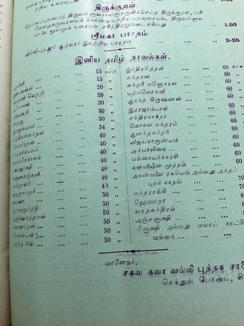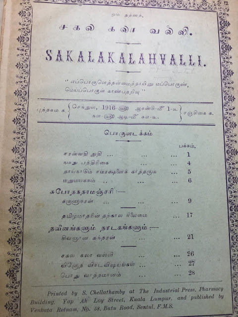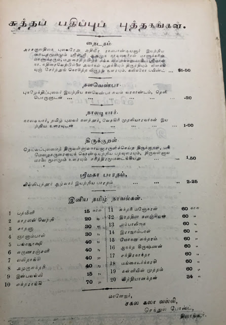 மலேயாவிலிருந்து வந்த சகலகலாவல்லி பத்திரிக்கை விளம்பரப்படி 1916 ஆம் ஆண்டு வரை வந்த தமிழ் நாவல்கள், நாடகங்களின் பட்டியல் கீழே உள்ளது. அக்காலத்திலேயே இத்தனை புஸ்தகங்களை எழுதி தமிழ்  வளர்த்தோரை நினைவுகூறுவது நம் கடமை.