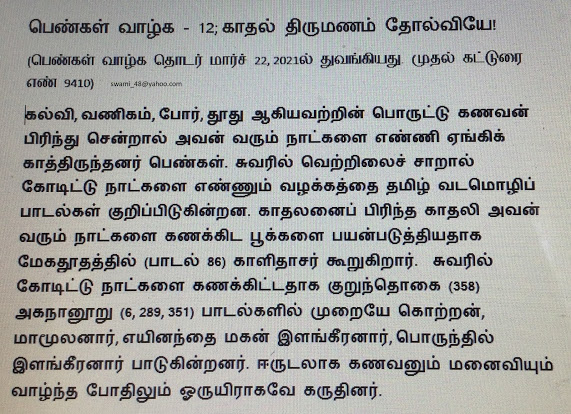 (பெண்கள் வாழ்க தொடர் மார்ச் 22, 2021ல் துவங்கியது. முதல் கட்டுரை எண் 9410)கல்வி, வணிகம், போர், தூது ஆகியவற்றின் பொருட்டு கணவன் பிரிந்து சென்றால் அவன் வரும் நாட்களை எண்ணி ஏங்கிக் காத்திருந்தனர் பெண்கள். சுவரில் வெற்றிலைச் சாறால்