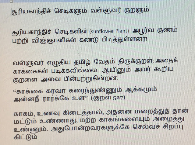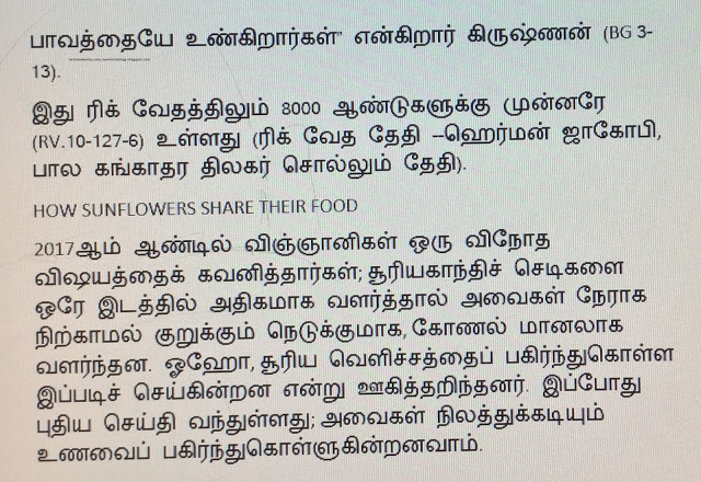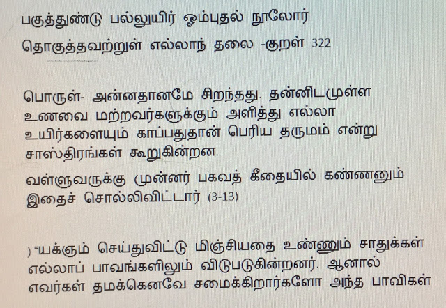 வேறு எந்த நாட்டு இலக்கியத்திலும் விருந்தாளிக்குப் போட்டுவிட்டுத்தான் சாப்பிட வேண்டும் என்று சொல்லவில்லை. அதை ஒரு தர்ம கைங்கர்யமாகவும் சொல்ல வில்லை. அன்ன சத்திரங்கள் ஆயிரம் அமைக்கவுமில்லை. மநு ஸ்ம்ருதியும், சிலப்பதிகாரமும், திருக்குறளும் சங்க இலக்கியமும் மட்டுமே செப்பும் கருத்து இது.