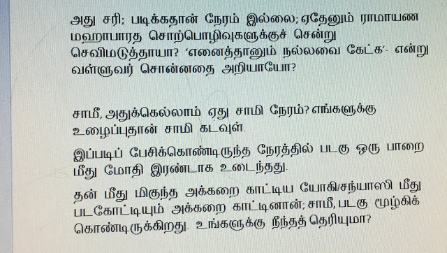 “நன்றாய் சொன்னாய், சின்ஹா! நீ இப்படி அசைக்க முடியாத நம்பிக்கையை உன் ம்தத்தின் மீது கொண்டால், இந்த பாரத நாட்டின் மீது கொண்டால், உன் சகோதர ஹிந்துக்களை இந்த பாதிரிமார்கள் மதமாற்றம் செய்வதைக் காணப் பொறுக்கமாட்டாய்.. ஒவ்வொரு நாளும் இந்த மதமாற்றம் நடந்து கொண்டிருக்கிறது. என்றாலும் கூட நீ சும்மாதான் இருக்கிறாய்? எங்கே உன் மதப்பற்று? எங்கே உன் தேசபக்தி? ஒவ்வொரு நாளும் கிறிஸ்தவ பிரசாரகர்கள் உன் கண் முன்னாலேயே ஹிந்து மதத்தை இழிவு படுத்திப் பேசிக்கொண்டே இருக்கிறார்கள். அதைக் கண்டித்து ஹிந்து மதத்தைக் காப்பாற்றும் வகையில் எத்தனை பேர் முன் வருகிறார்கள்?” என்று கேட்டார்.