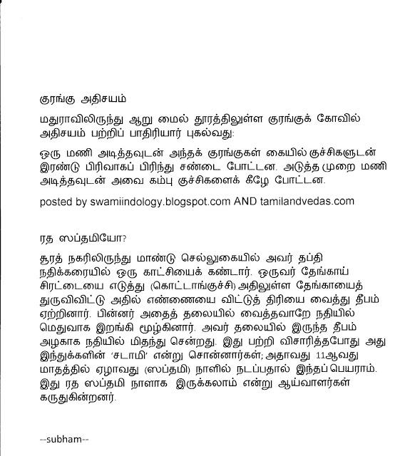 இப்படி 13 மந்திரங்கள். இவை எல்லாவற்றுக்கும் பொருள் உண்டு. நமக்குத் தெரியாது. வெள்ளைக்காரப் பயல்கள் இவை எல்லாம் ஒலி நயம் மிக்க பிதற்றல்கள் (ONOMOTOPEIC ) என்று எழுதிவைத்துவிட்டான். வேதத்தில் 60090 போன்ற எண்கள் வந்த இடம் எல்லாம் இவை கற்பனை சிறகடித்ததால் வந்த பொருளற்ற எண்கள்(FACY NUMBERS) என்று எழுதி வைத்துவிட்டான். சாயனர் போன்றோர், நமக்கு 700 ஆண்டுகளுக்கு முன்னர் வாழ்ந்ததால் அவர்களுக்கும் பொருள் விளங்கவில்லை. நாம் இப்போது பேந்தப் பேந்த முழிக்கிறோம். ஆயினும் இவைகள் யாகத்தின்போது பயன்படுத்தப்பட்டன என்பதை அறிகிறோம்.