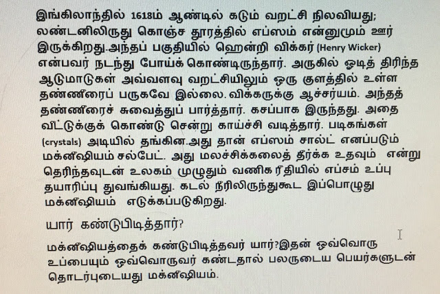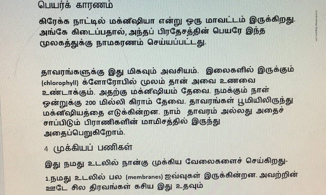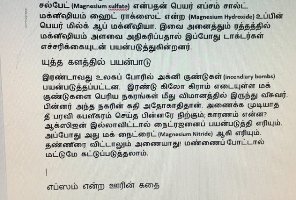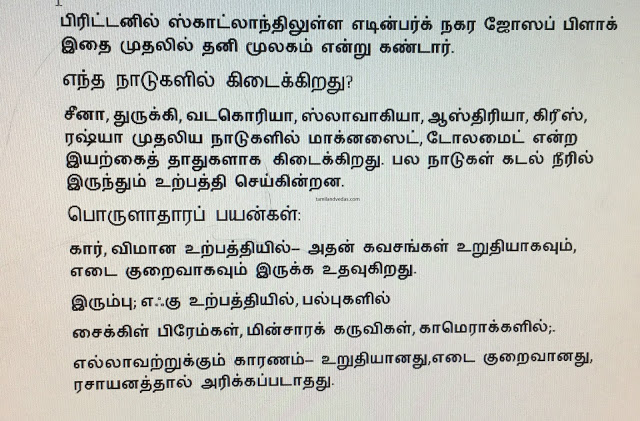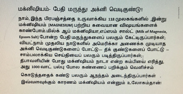 மூலகங்கள் இந்த பிரபஞ்சத்தை உருவாக்கிய அஸ்திவாரக் கற்கள். 118 மூலகங்கள் திட, திரவ, வாயு ரூபங்களில் இருக்கும். அவற்றில் ஒன்று மக்னீஷியம் (MAGNESIUM). அதைக் கண்டு பிடித்தவர் சுவீடன் நாட்டைச் சேர்ந்த ஷீல் (SCHEELE) என்பவர் ஆவார்.